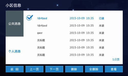 1)存儲管理中心發布的小區公共消息與個人消息,包括標題、時間、已讀未讀,可點擊查看詳細的信息內容,也可進行刪除與全