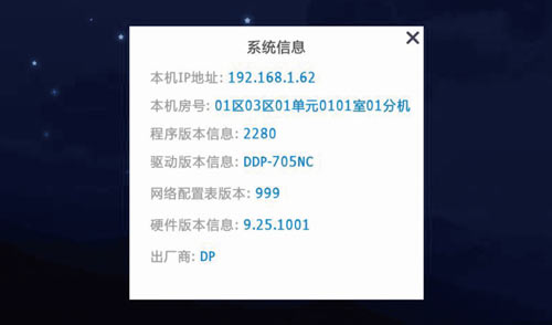1)可查看本機編號,IP地址、子網掩碼、網關地址,程序版本信息,出場商和網絡配置表,如圖3.7.2: