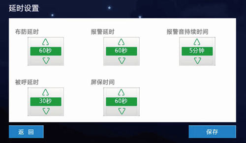 1)設置布防延時,報警延時,報警音持續時間,被呼延時,屏保時間。布防延時選項為30S,60S,99S。報警延時選項為0S,30S,60S。報警音持續時間選項為3M,5M,10M。被呼延時選項為30s,60S,90S.屏保時間選項為30S,60S,90S。設置界面如圖3.7.8:
