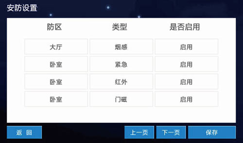 1)設置八防區的地點,類型和是否啟用,下一頁可查看下一頁的防區設置,點擊保存可保存防區信息的設置,如圖3.8.2: