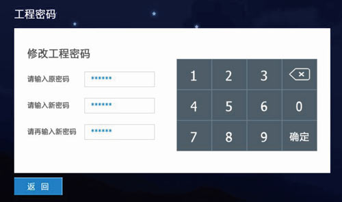 1)輸入6位舊密碼,再輸入兩次相同新密碼設置新的工程密碼,默認出廠時的工程密碼為“666666”如圖3.8.5:
