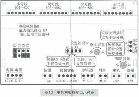 安裝施工調試時,安裝工作人員可以根據現場環境的需要進行一些調整,比如,通話聲音過大或過小,可以稍微調整“咪頭音量”的電位器(如圖10所示),一般不用調整。設備受施工場所、環境、線材質量等因素的影響,主機或分機可能會出現嘯叫聲。如果出現此類情況,安裝工作人可以通過調整“咪頭音量”和“喇叭音量”的電位器(如圖10所示)。電位器的調整方法:逆時針旋轉半圈至一圈慢慢調小,直至嘯叫聲消失,主機和分機都能聽到最大最清晰最洪亮的對話即調試完畢。